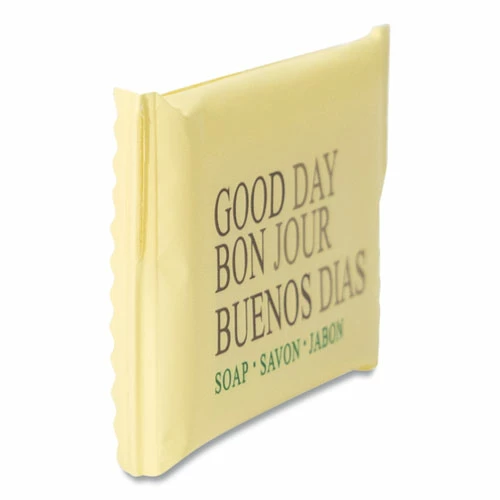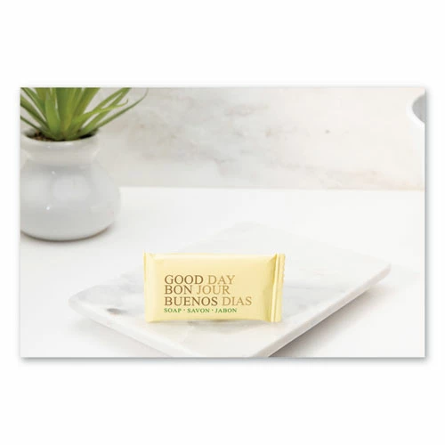 Pamper your guests without zapping your budget with high-quality, value-priced Good Day™ soap. A rich, luxurious lather and a pleasant, neutral scent lends it a spa-like appeal. Specially formulated wrapper protects bar from moisture and humidity. Trilingual: English-, Spanish- and French-text packaging.